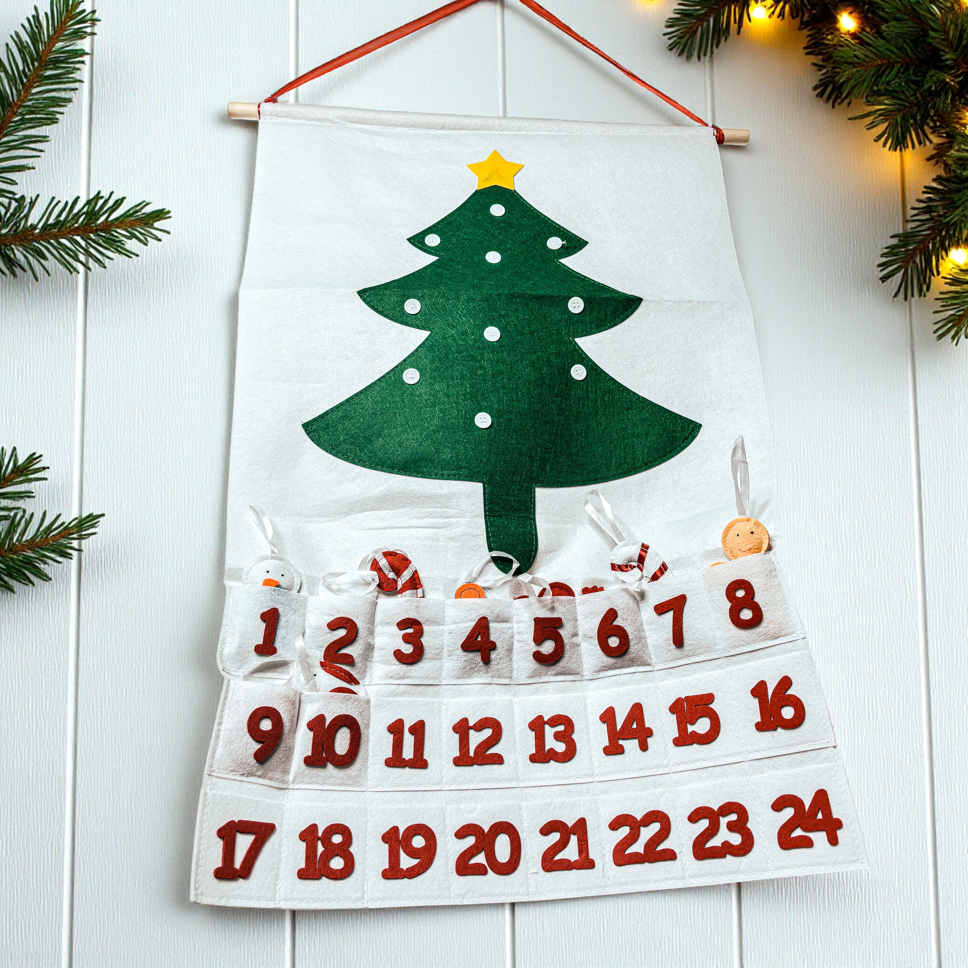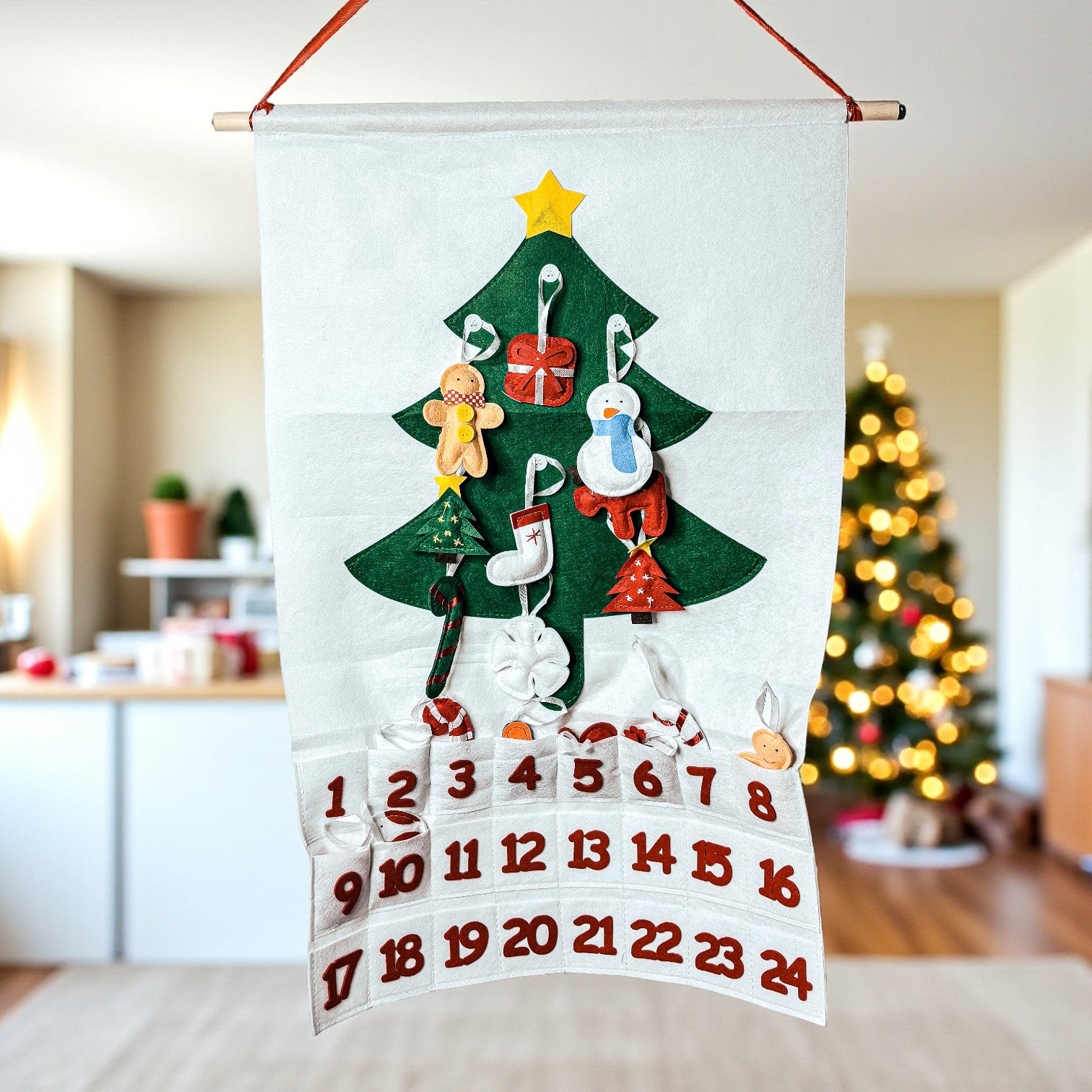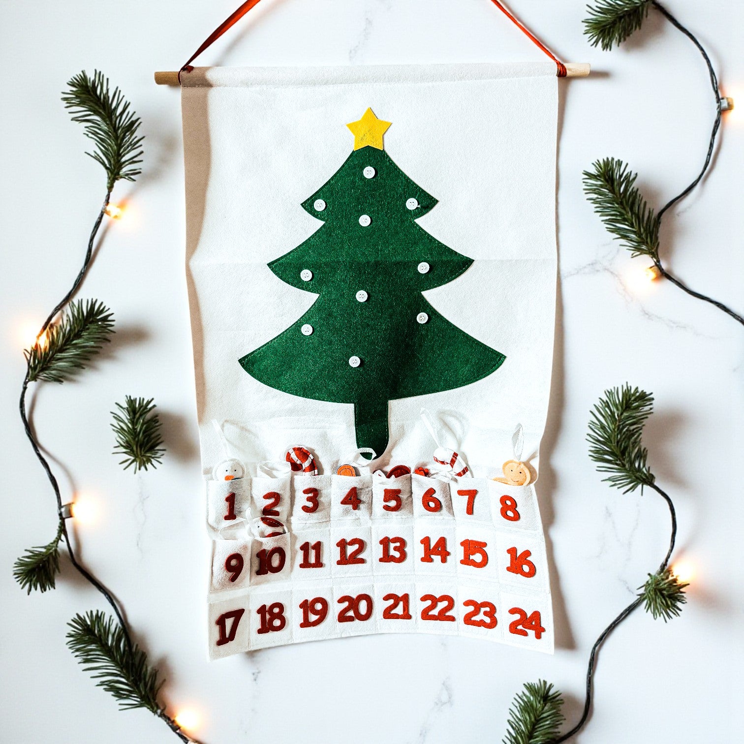 Countdown to Christmas with this Hand-Crafted Advent Calendar. Features a beautifully embroidered Christmas tree and includes cute handmade felt ornaments that are hung onto the advent tree during the season, around the house, doorknobs, your Christmas Tree or whatever you wish with!