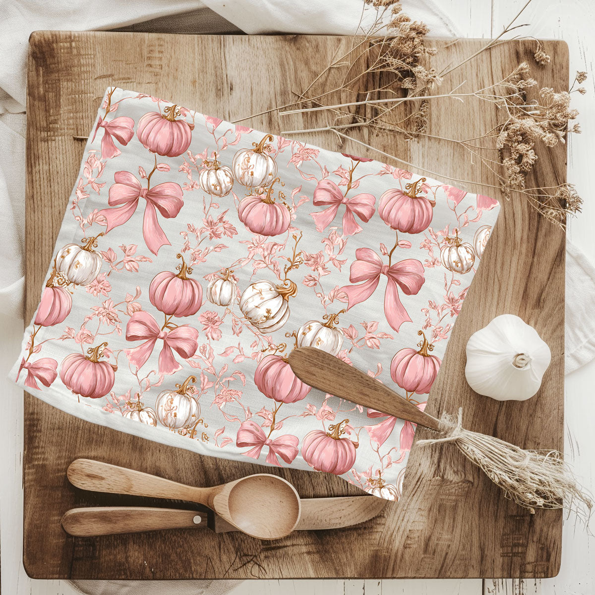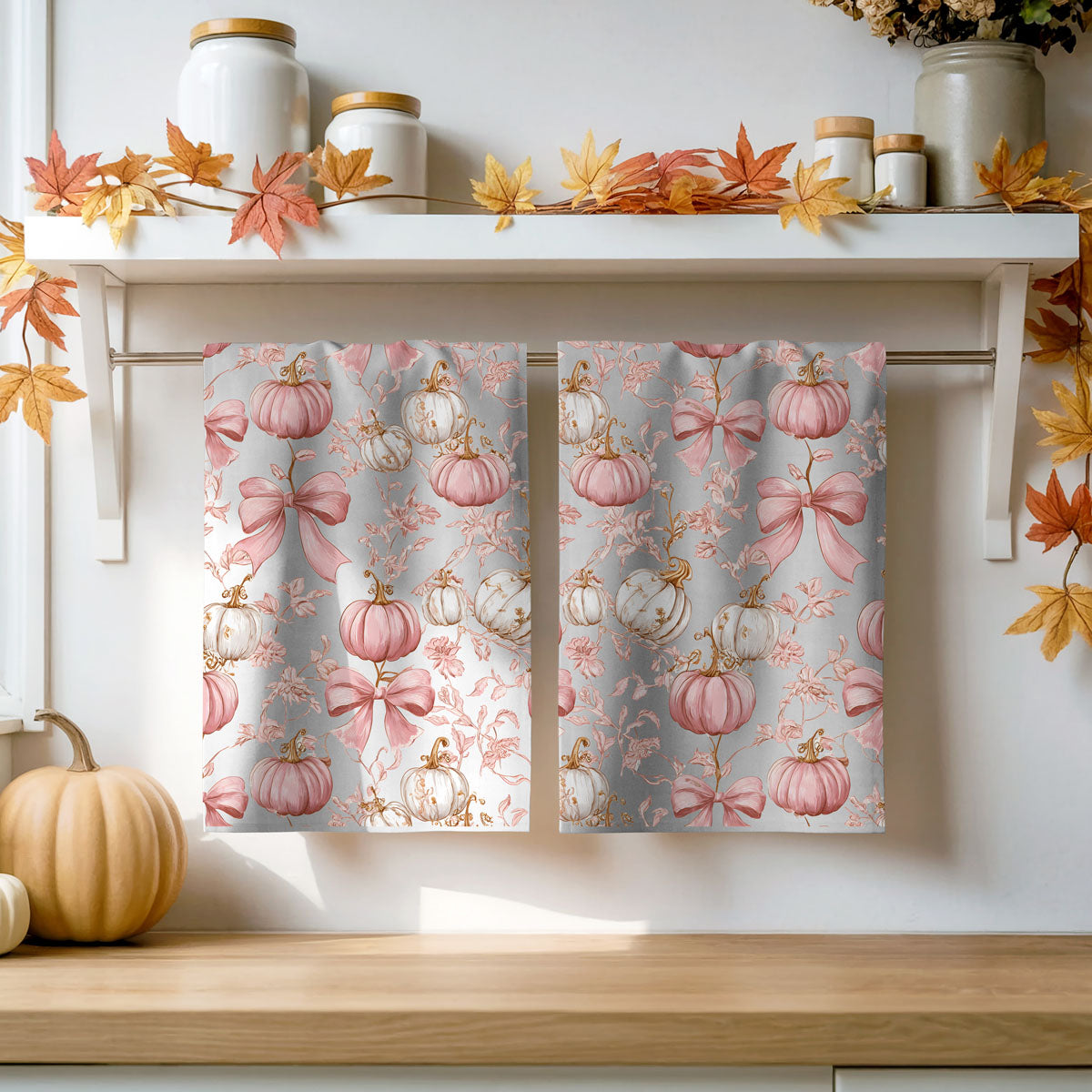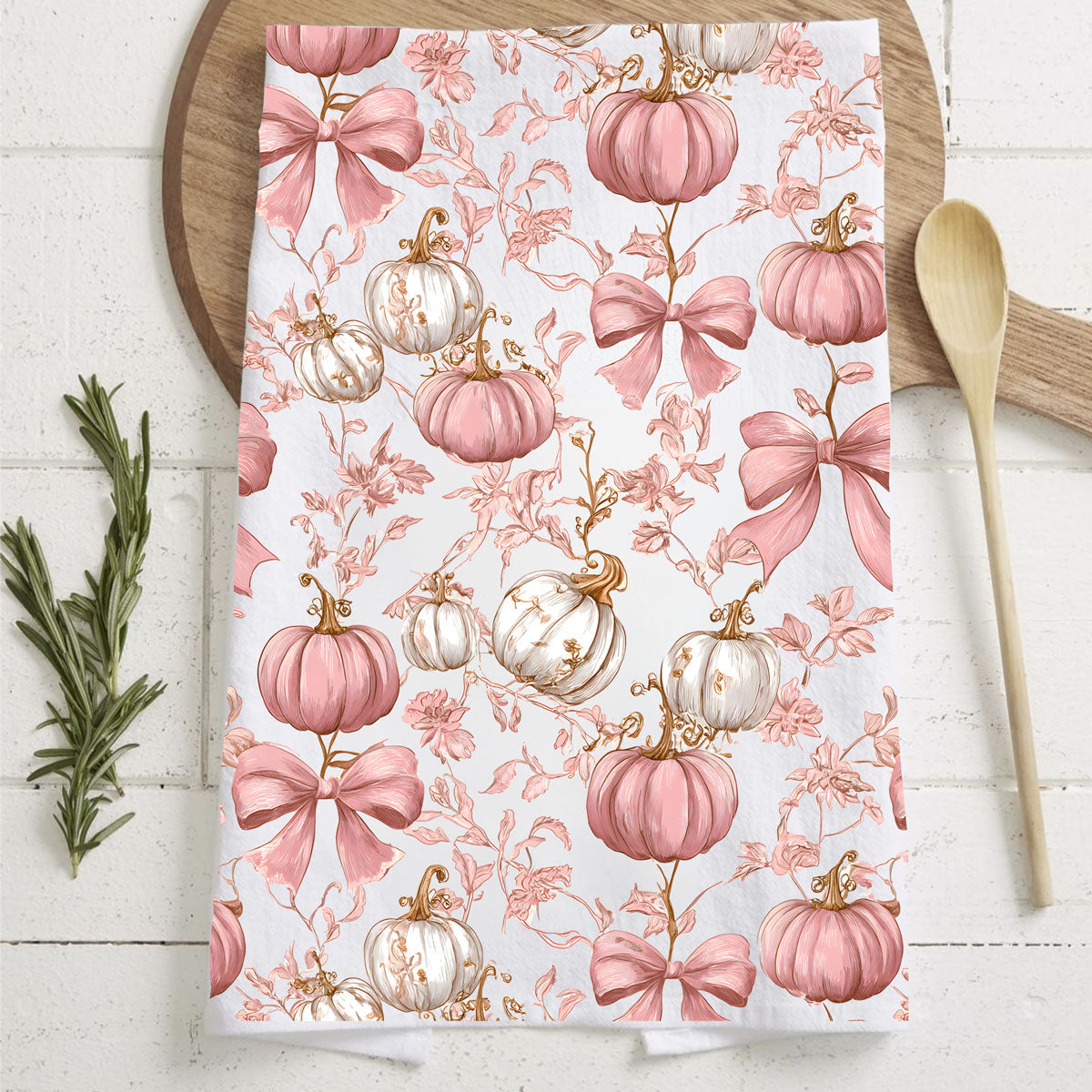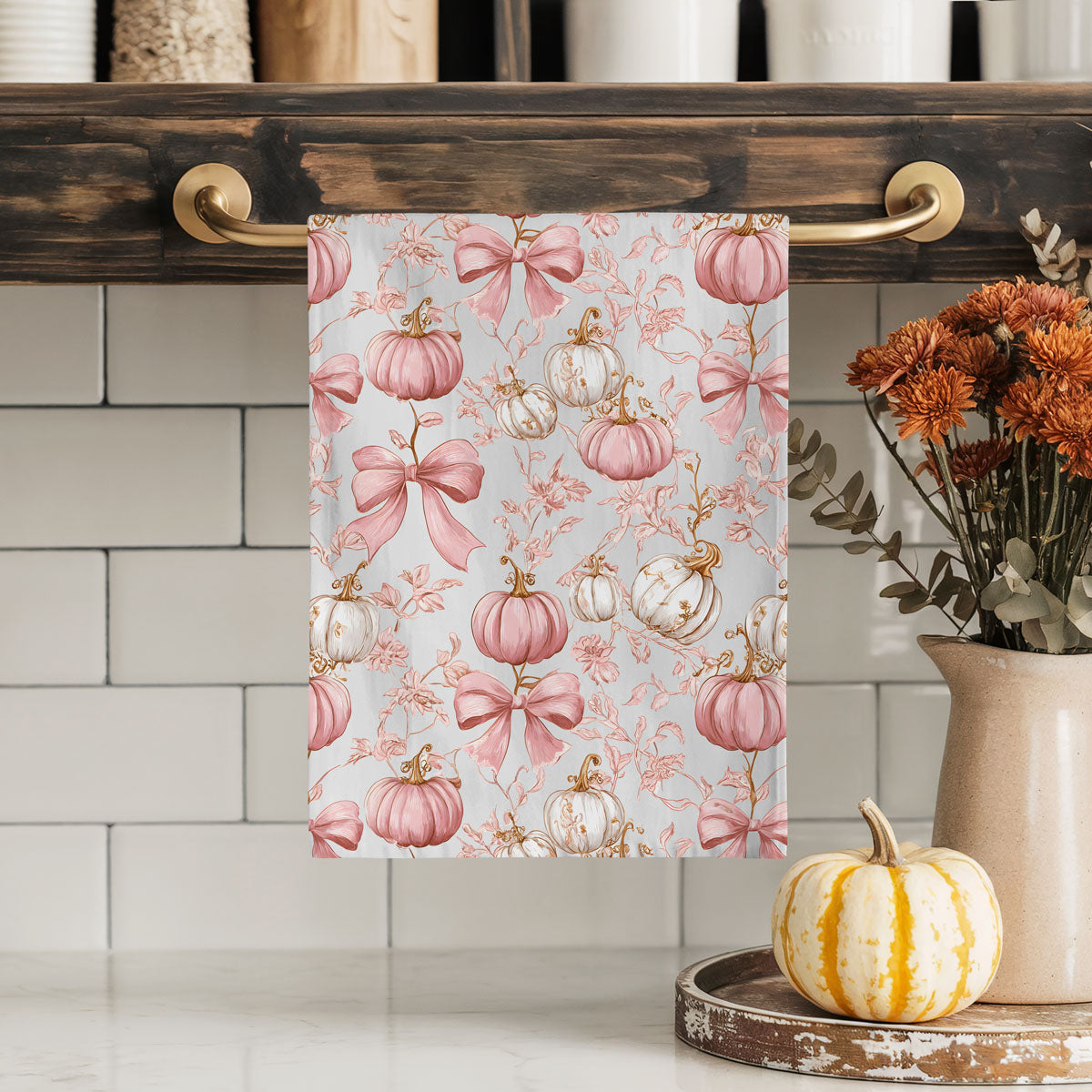 This pink pumpkin kitchen towel looks like a Hallmark movie and a Paris boutique had a fall baby. Soft blush pumpkins, dainty florals, and big swoopy bows turn your oven handle into a full-on aesthetic moment.