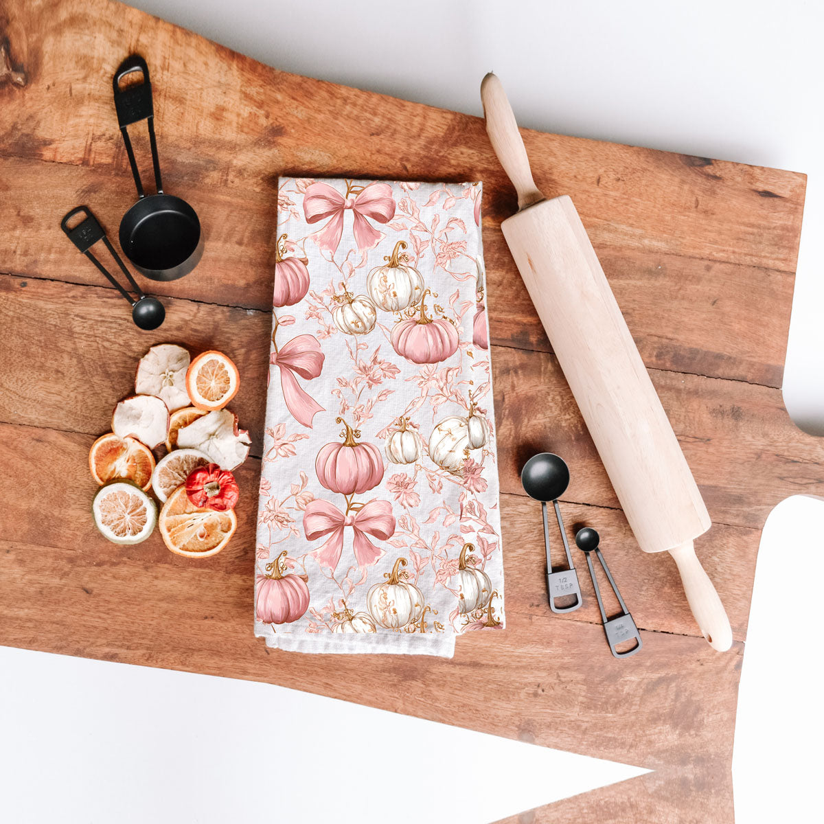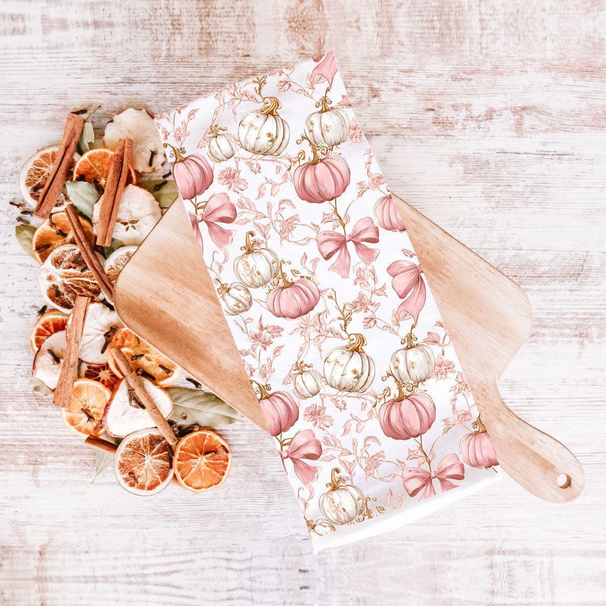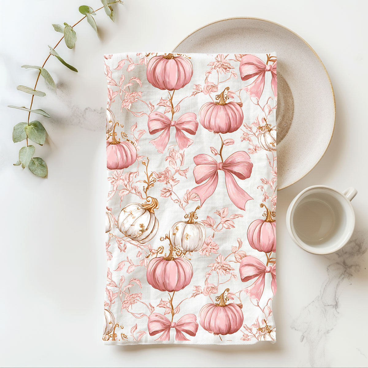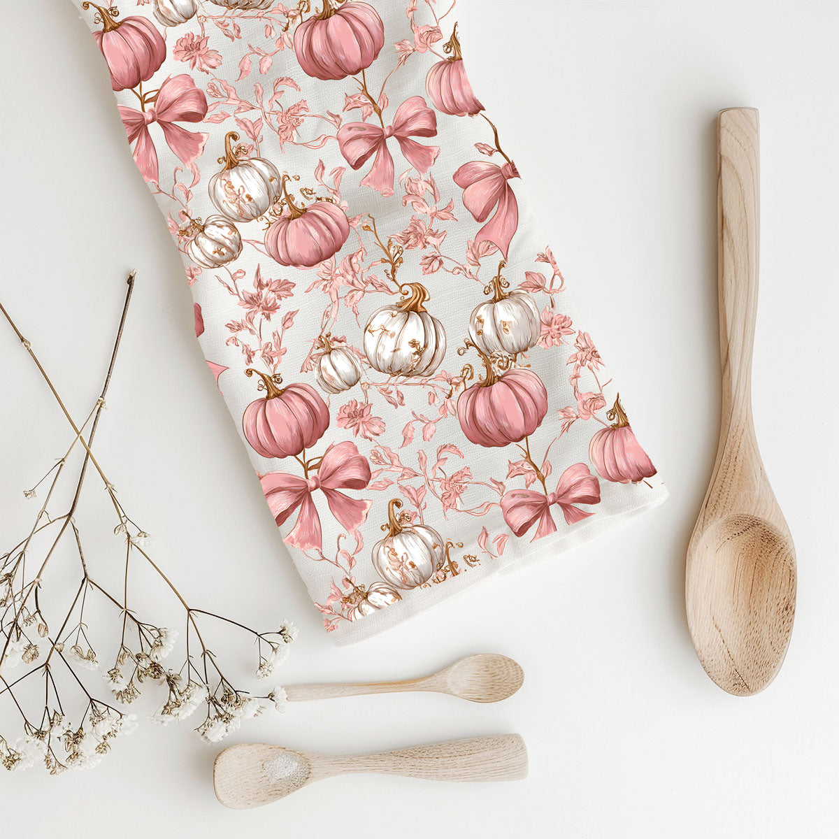 This pink pumpkin kitchen towel looks like a Hallmark movie and a Paris boutique had a fall baby. Soft blush pumpkins, dainty florals, and big swoopy bows turn your oven handle into a full-on aesthetic moment.