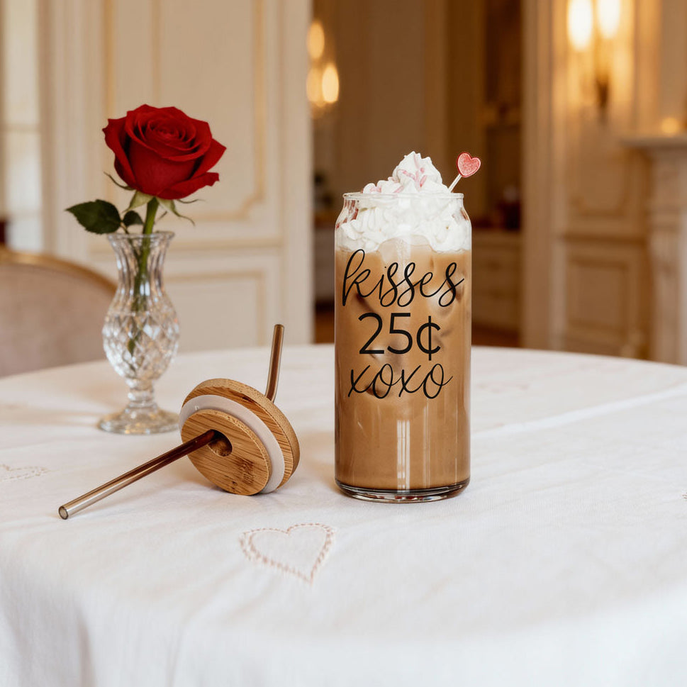 Get ready to sip on some love! This adorable 20oz glass cup cheekily announces “Kisses 25 Cents,” complete with a sweet “xoxo” underneath. Perfect for offering up affordable affection or simply enjoying your favorite beverage with a side of sass!