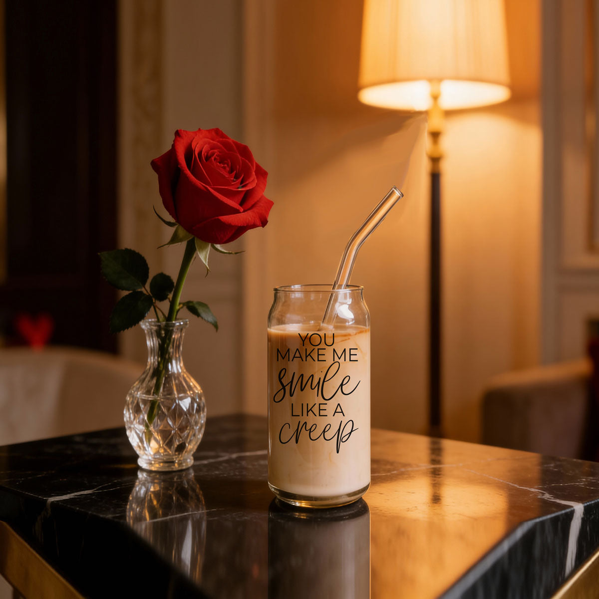 Sip with a side of sass! This 20oz glass cup hilariously proclaims “You Make Me Smile Like a Creep,” because let’s face it, we all have those moments when we can’t help but grin a little too wide. Perfect for those cheeky moods when you just can’t contain your inner weirdo!