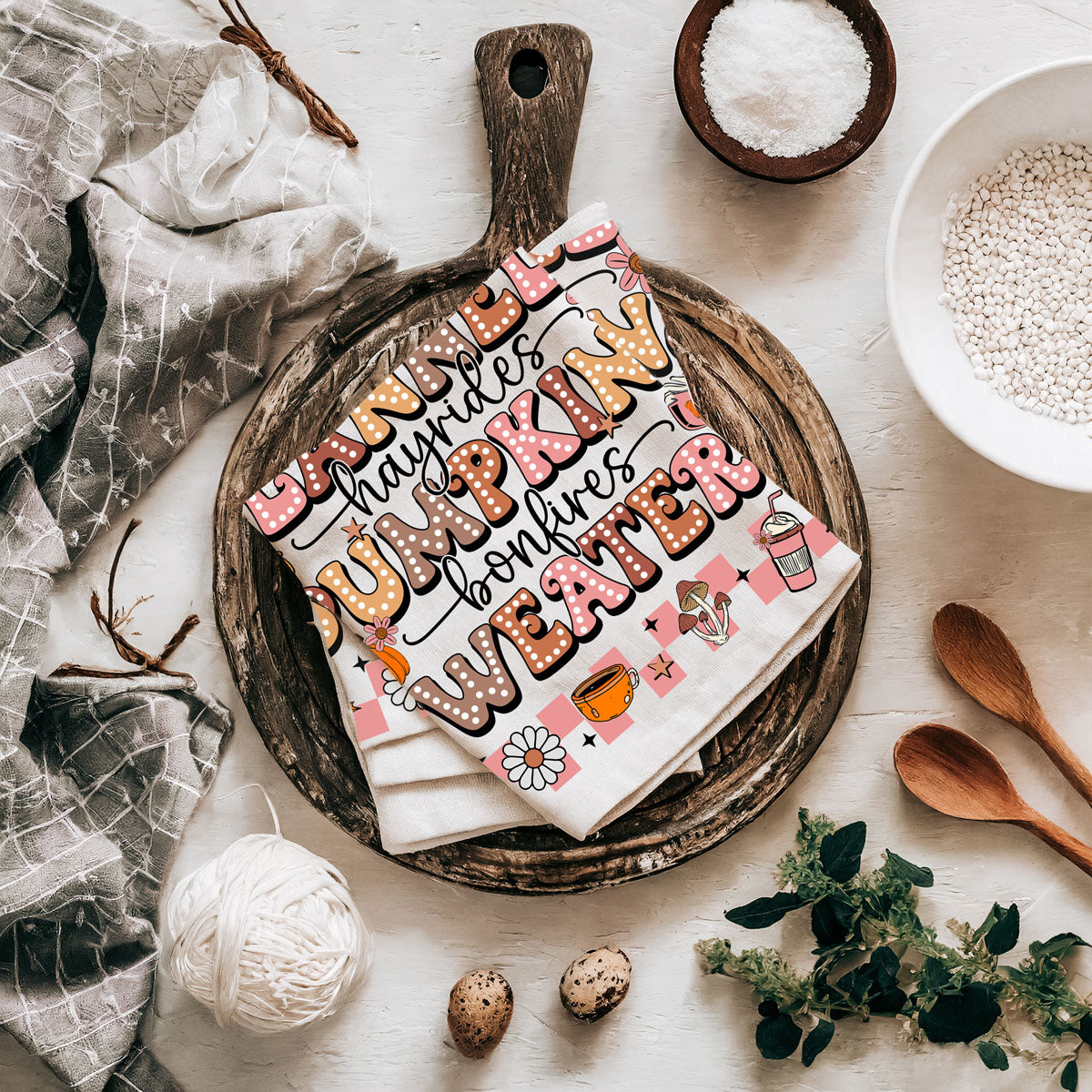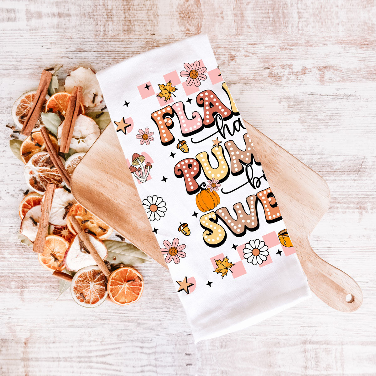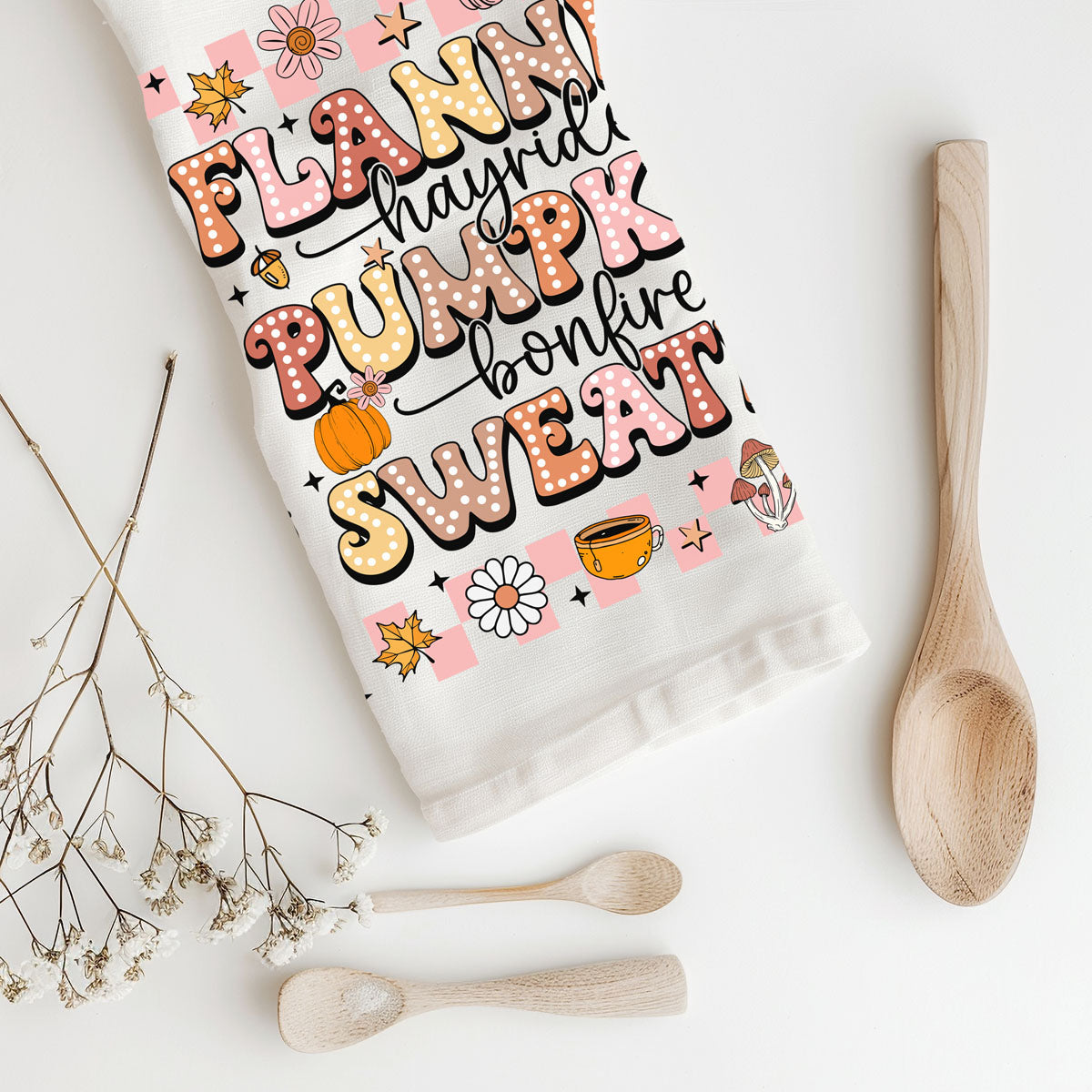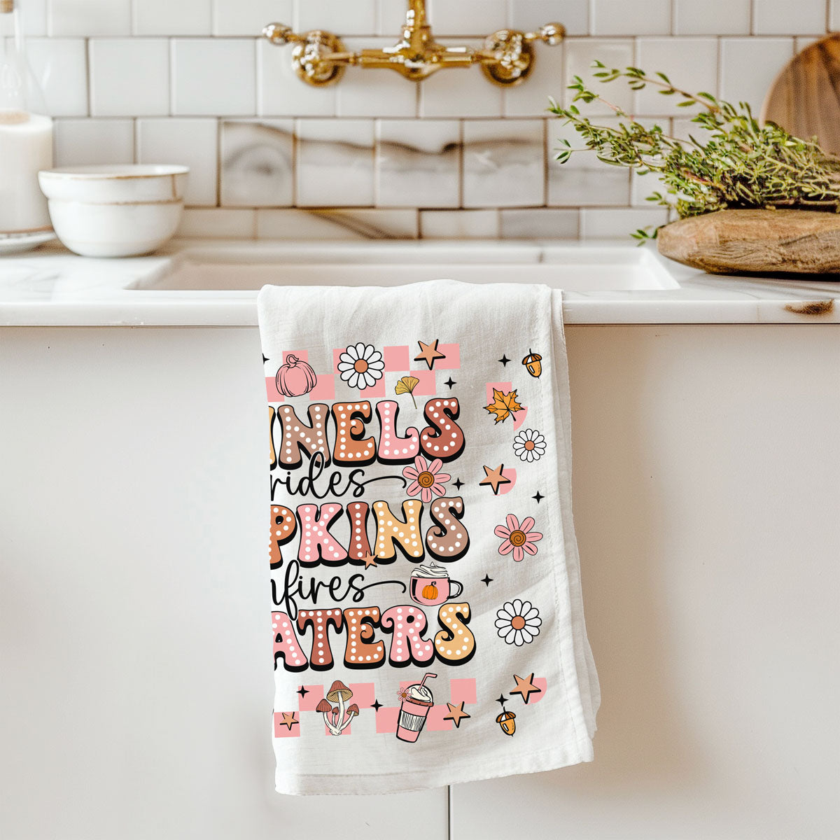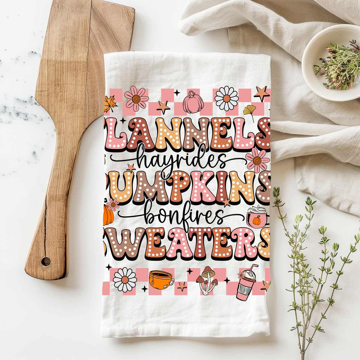 This pink retro fall kitchen towel shouts everything you love about the season in big bubbly letters: FLANNELS • hayrides • PUMPKINS • bonfires • SWEATERS—surrounded by daisies, coffee cups, mushrooms, and little pumpkins in the cutest ’70s color palette.
